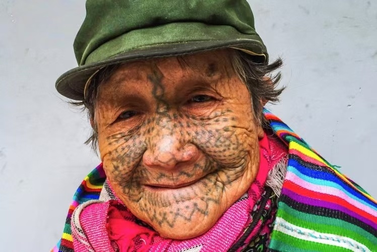 备注:关于纹面的由来,有许多观点,至今,也没有权威的说法来解释纹面。民间流传最广的有这三种说法:一是独龙江为了防止西藏察瓦龙土司抢女人,女孩子一般到12至15岁便要纹面,纹面的女人看起来丑陋,察瓦龙土司,就不会来抢女人。二是纹面习俗与该族早已消失的图腾崇拜物有关。三是当时的独龙族认为妇女纹面是美的象征,不纹面的姑娘,以后是嫁不出去的。如今独龙江流域已经没有了纹面的习俗,很多女孩子也不愿意纹面。据了解,现在独龙族纹面女只有不到25人在世,其中年龄最大的超过100岁,最年轻的纹也已六十岁。随着时间的不断推移,古老秘的纹面女最终将消失在滚滚历史长河中。