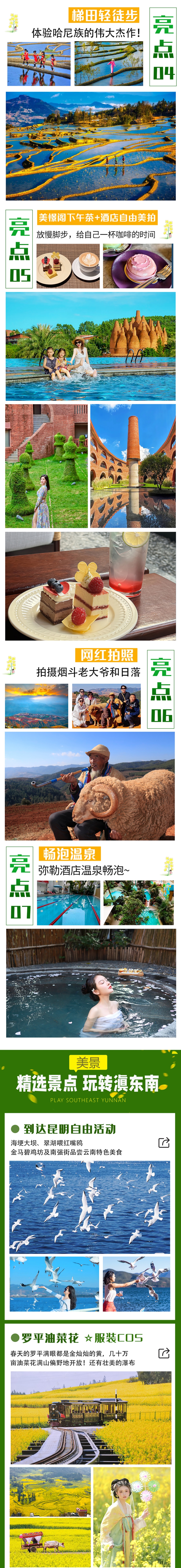 1. 【独家全景】:独家策划的经典滇东南大环线,所有精华景点,全部一网打尽,不留遗憾。前往《庆余年》《芳华》《三生三世》等影视拍摄地,以及万花筒艺术馆《东风韵》只带您在最美的季节看醉美的风景。