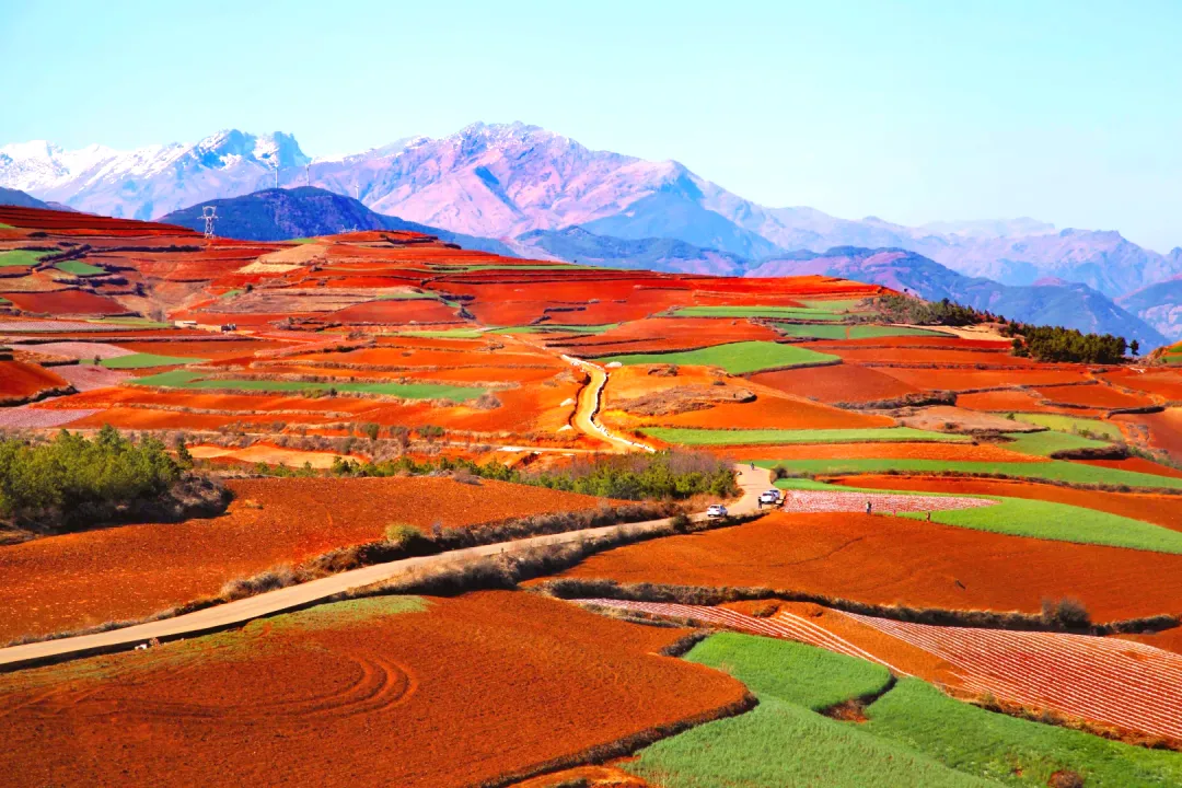 之后行车约4.5小时左右到达【东川红土地】。先沿途拍摄线条流畅的【乐谱凹】,然后前往【落霞沟】,这里的红土地上映出朵朵白云,忽明忽暗,顺光高点红土地会呈现出艳丽的光影。放眼望去,仿佛是天公涂抹的板块一样斑斓炫目。