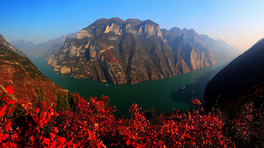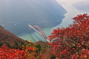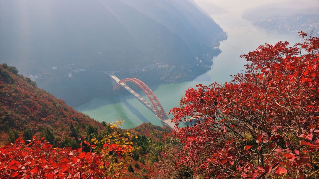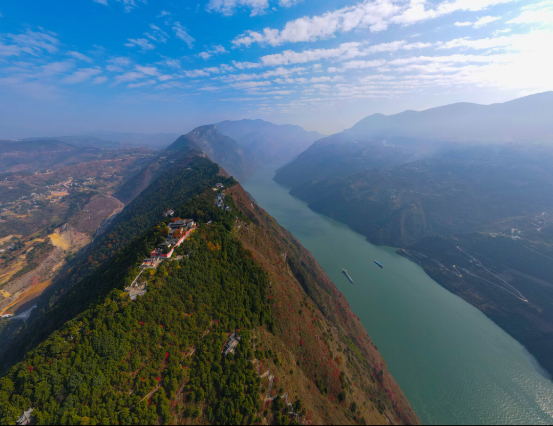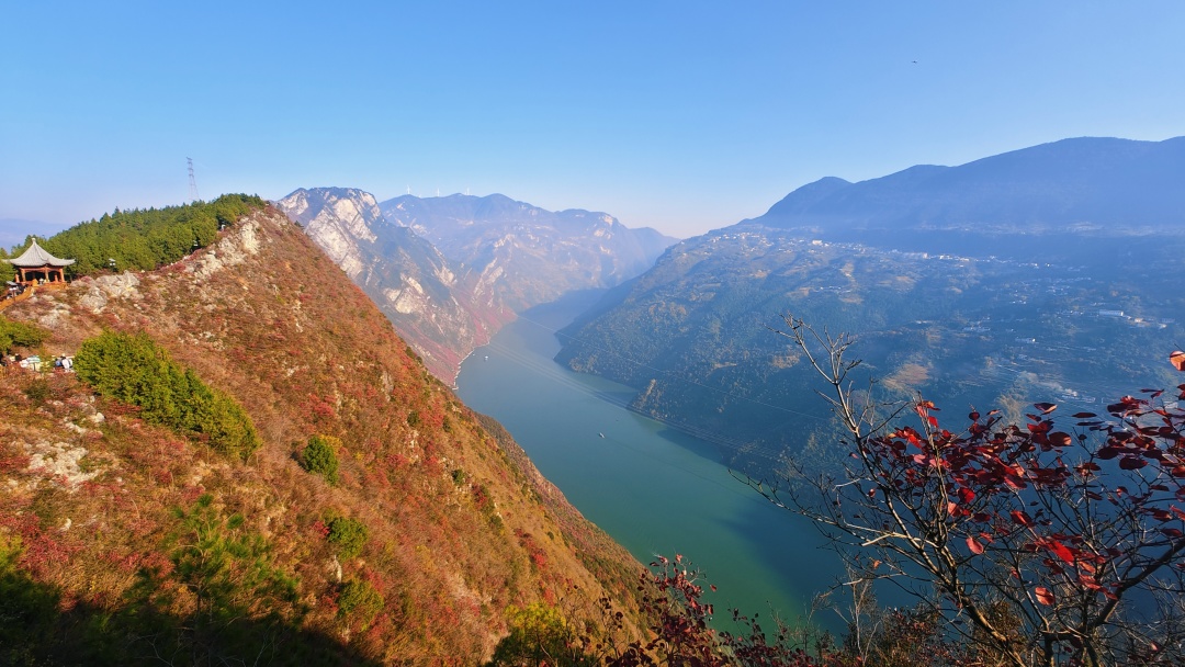 沿着健身步道拾级而上,站在观景亭内,可观秀美的巫峡、长江壮丽的高峡平湖、巫山十二峰胜景、新县城全貌。进入冬季,文峰山上漫山红遍,十分壮观。