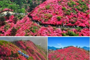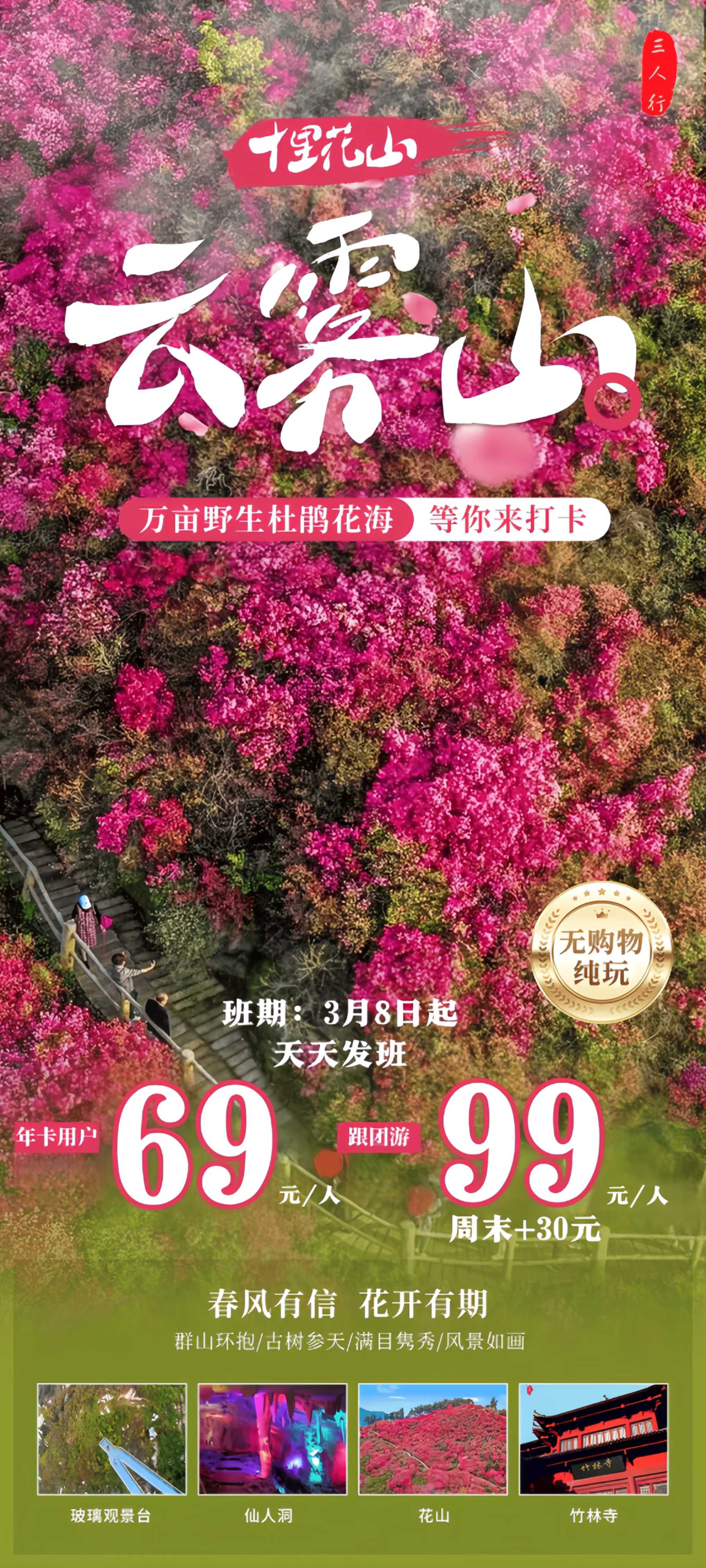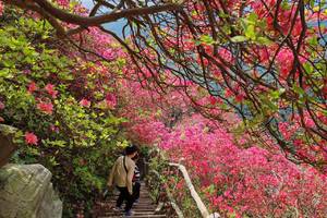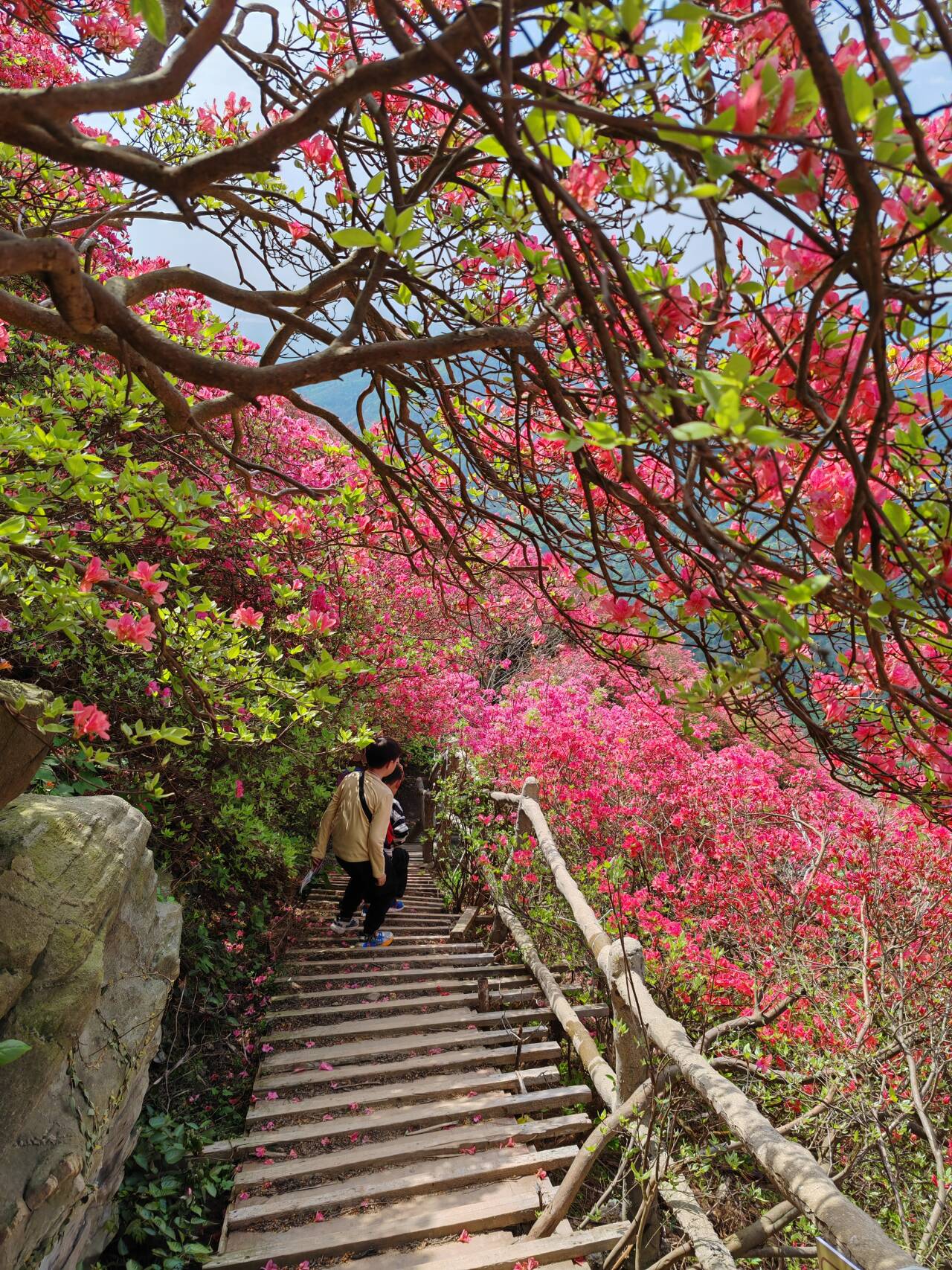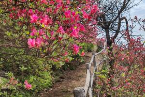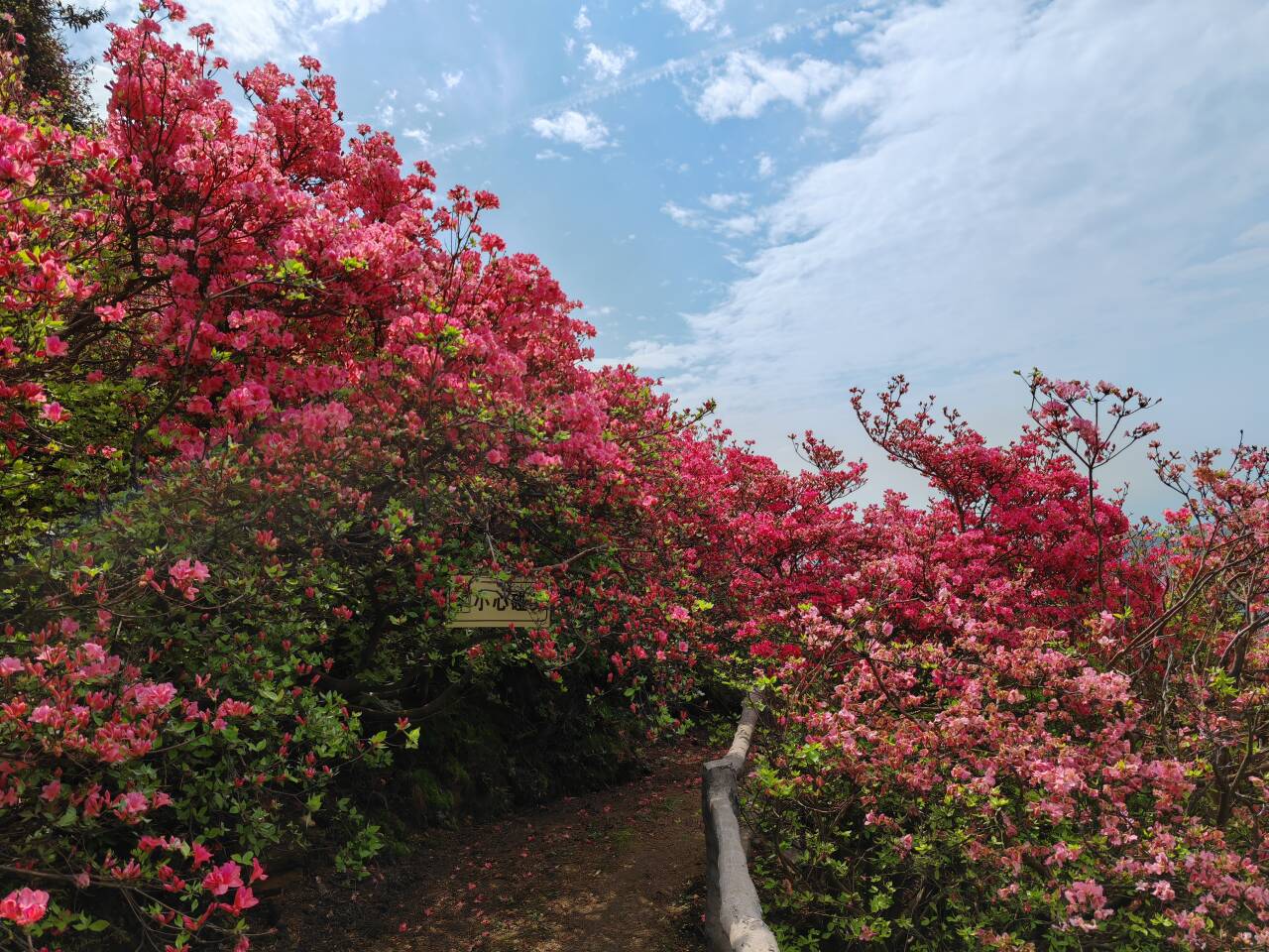 云雾山杜鹃的观花期从 3 月初到 5 月初,长达一个半月之久,真可谓“人间仙境云雾山,层峦叠嶂映红天”。每逢春夏之交,绿色的云雾山成了一片火红的海洋,红者欲燃,粉者如霞。漫山遍野竞相开放,堪称华中一绝。
