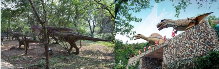 恐龙谷占地面积 40 万平方米,由恐龙观赏区、科普展示区、互动娱乐区部分组成。山林中分布数百条仿真恐龙,数十个恐龙生活情景项目。三纪、侏罗纪、白垩纪三个地质时代的恐龙都有~小朋友们还可以骑恐龙、穿恐道具展开一段神奇“恐龙之旅”。
