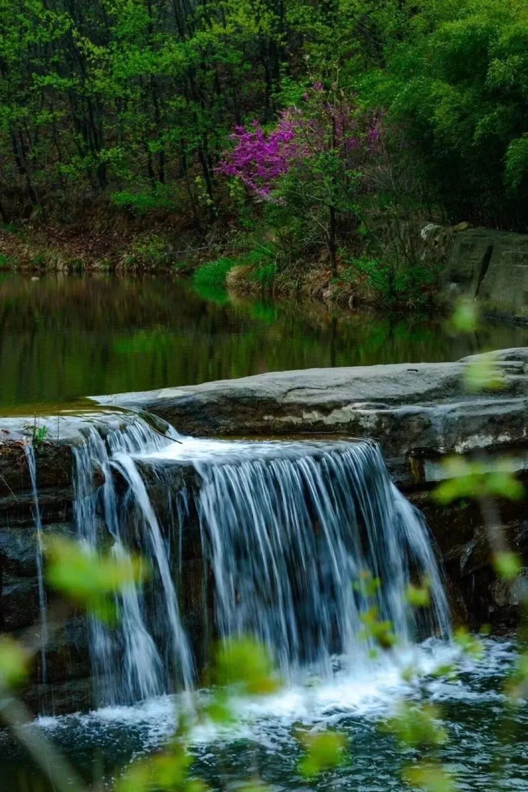 山花烂漫:潭边盛开的山桃花或连翘花,点缀在青石与碧水之间,为这幅山水画卷增添了灵动的色彩。