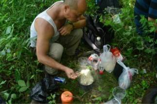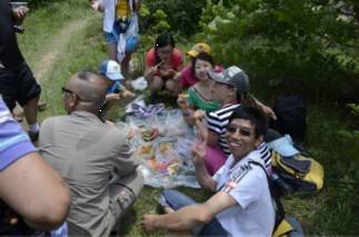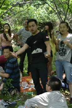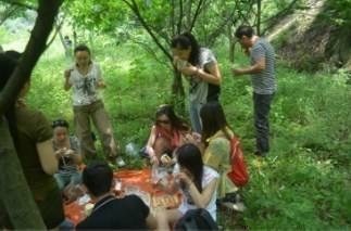 山谷里的野桃勾起了大家的食欲,此时的时针已经指向中午的12点钟,开饭啦!大家各自拿出自带的卤味美食围在一起,