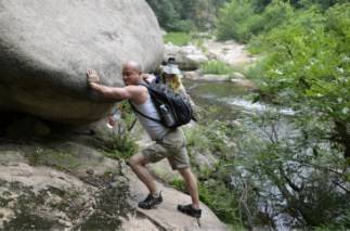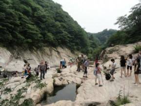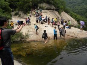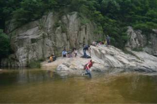 这里的潭水不是很深,可是真的很凉,说好了大家一起失(湿)身的,路过了几个水潭边,没有几个愿意下水的,好在那潭水不是用来游泳的,是让人欣赏的。。。  从九女潭峡谷穿越而出,来到了河南地界的一个小山村,上了机耕路,徒步大约有1个多小时,终于回到了始发地,我们挥手告别了美丽的九女潭,结束了这次愉快的旅行。 真是不枉此行啊! 再见了!九女潭----- 你的景色和故事一样的美,如果哪天遇到朋友将你再次提起时,我想------ 我还会考虑再来看你的..... |