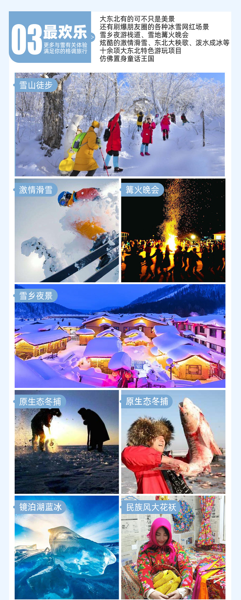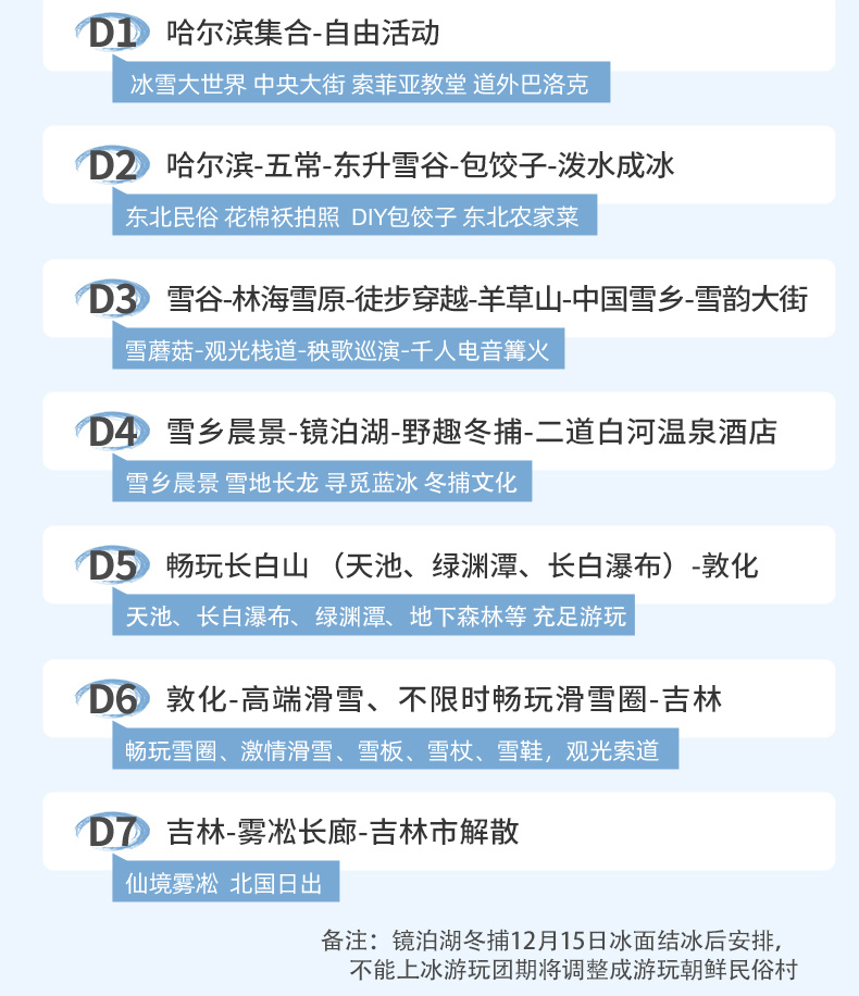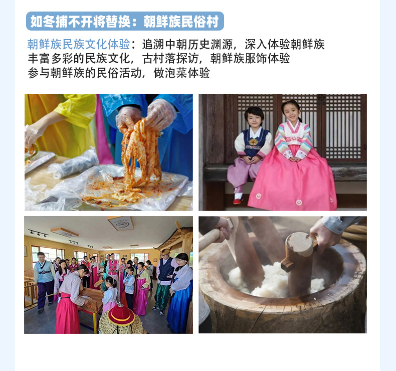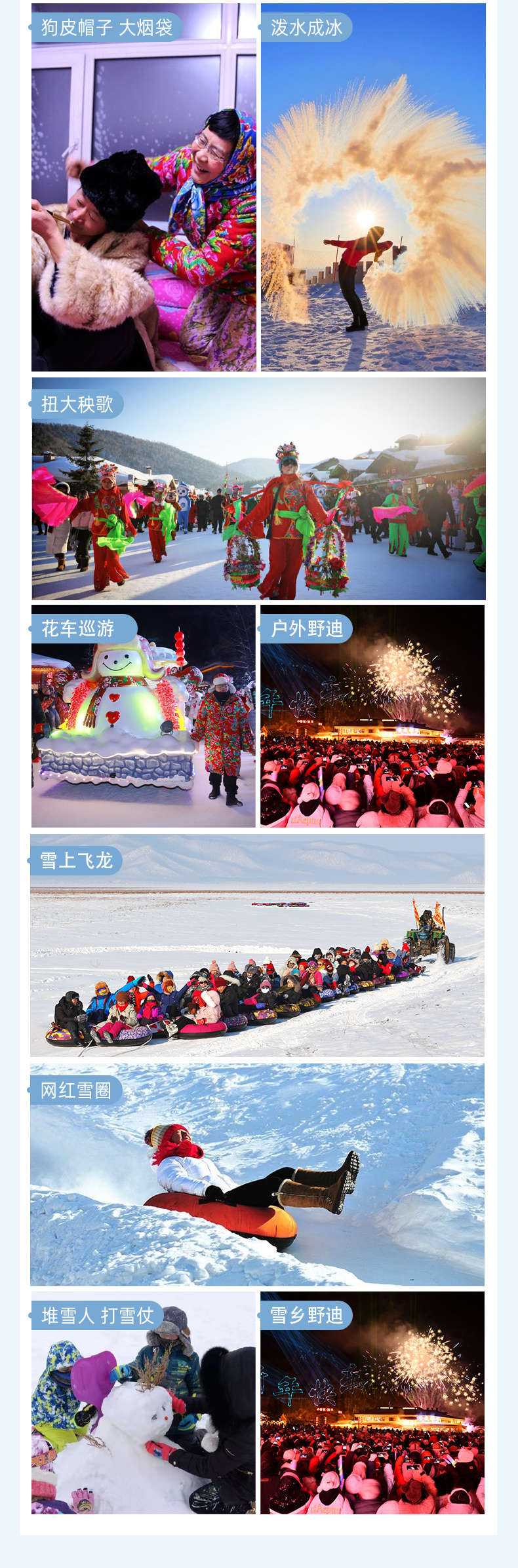 备注:【寒地冬捕】【雪上飞龙】【泼水成冰】等雪上活动12月中旬冰面封冻体验;如不能玩冰上活动会替换成朝鲜族民俗村。