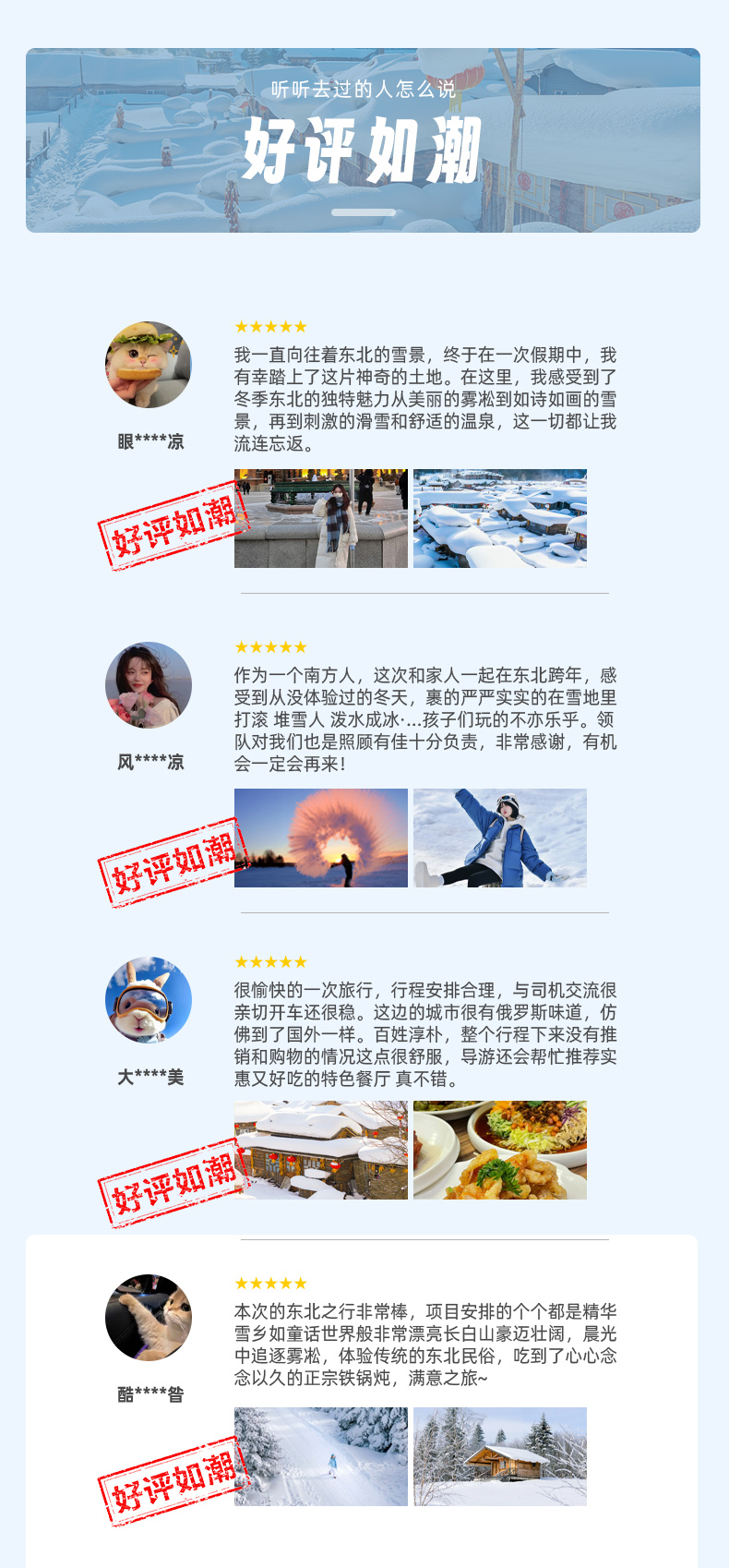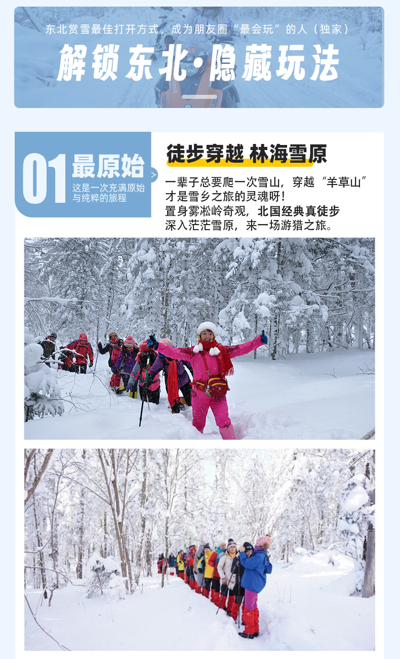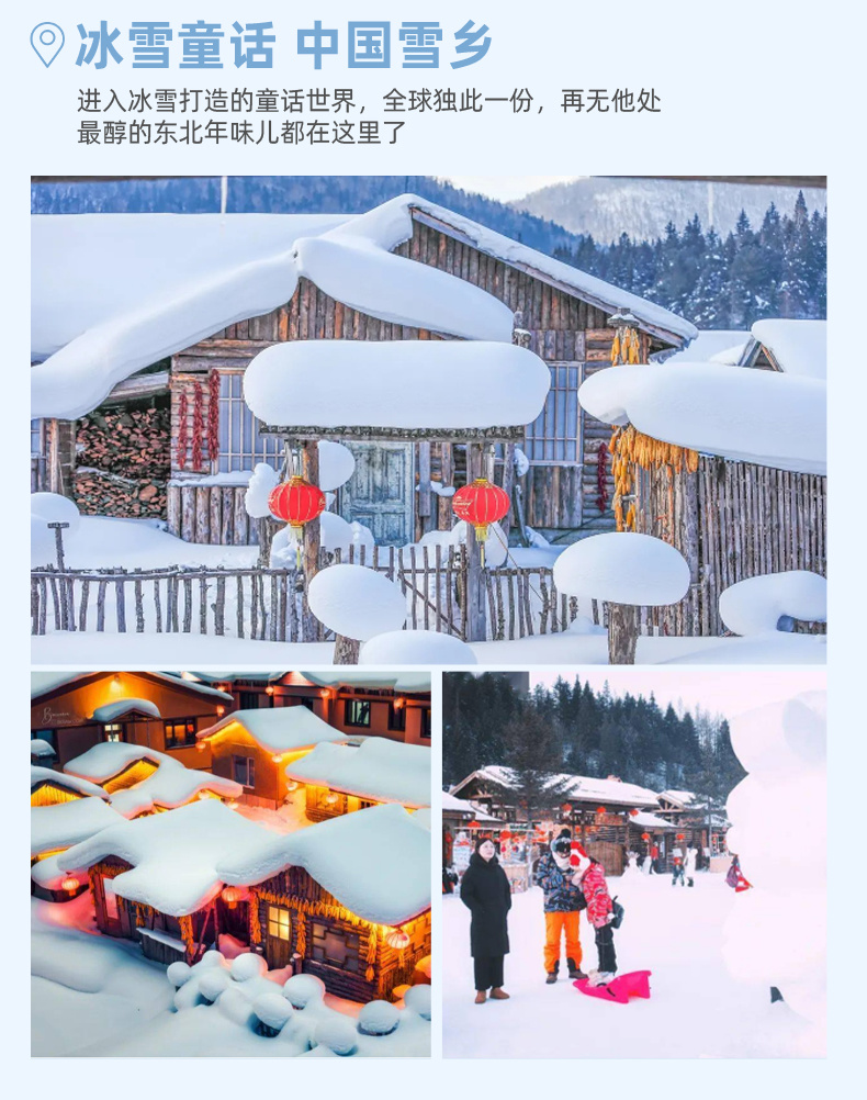 备注:【寒地冬捕】【雪上飞龙】【泼水成冰】等雪上活动12月中旬冰面封冻体验;如不能玩冰上活动会替换成朝鲜族民俗村。
