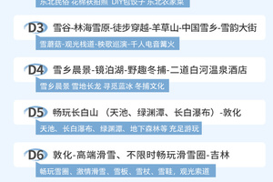 【门票】全程门票费:雪谷穿越门票、雪乡门票+景交车票、长白山北景区门票+景交车票(不含天池导站车票)、吉林滑雪场滑雪票(含雪杖/雪板/雪鞋/魔毯/雪圈)。