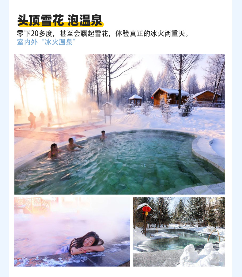 【二道白河温泉】赠送室内外寒地温泉体验。零下20多度,甚至会飘起雪花,但是只有泡室外温泉才过瘾,体验真正的冰火两重天。(不占床儿童不赠送)