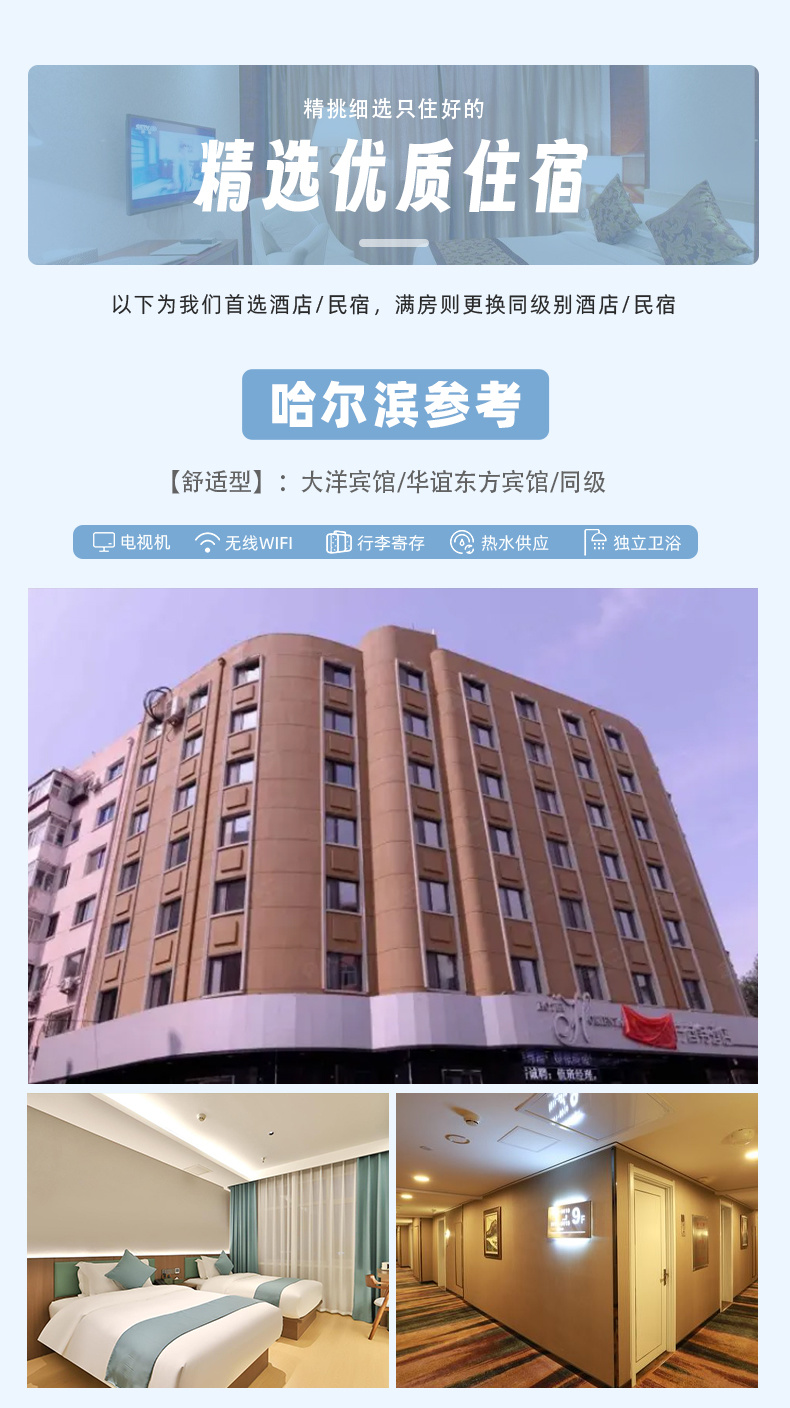 2、单房差:5晚酒店1300元每人,1晚雪乡农家炕单住报名时详询客服,报名人数为单数,需补1人单房差(1大1小报名,儿童默认占床必须补单房差)