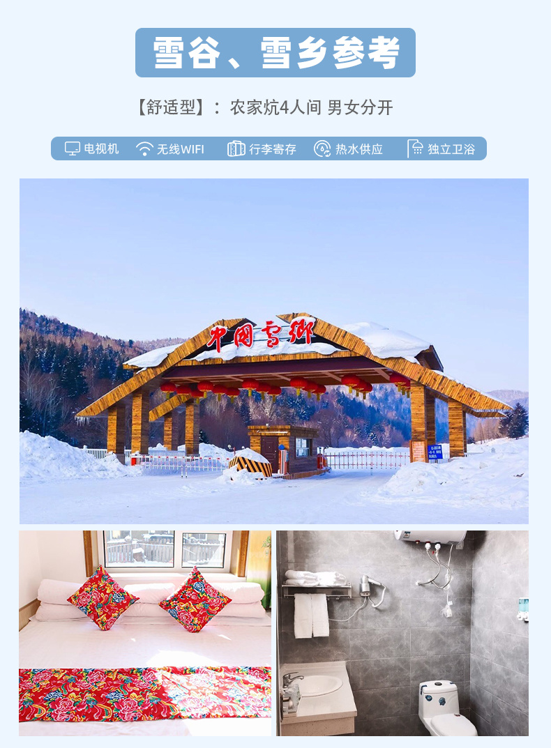 舒适型:雪谷、雪乡农家炕为同性4人一间(男女分开)