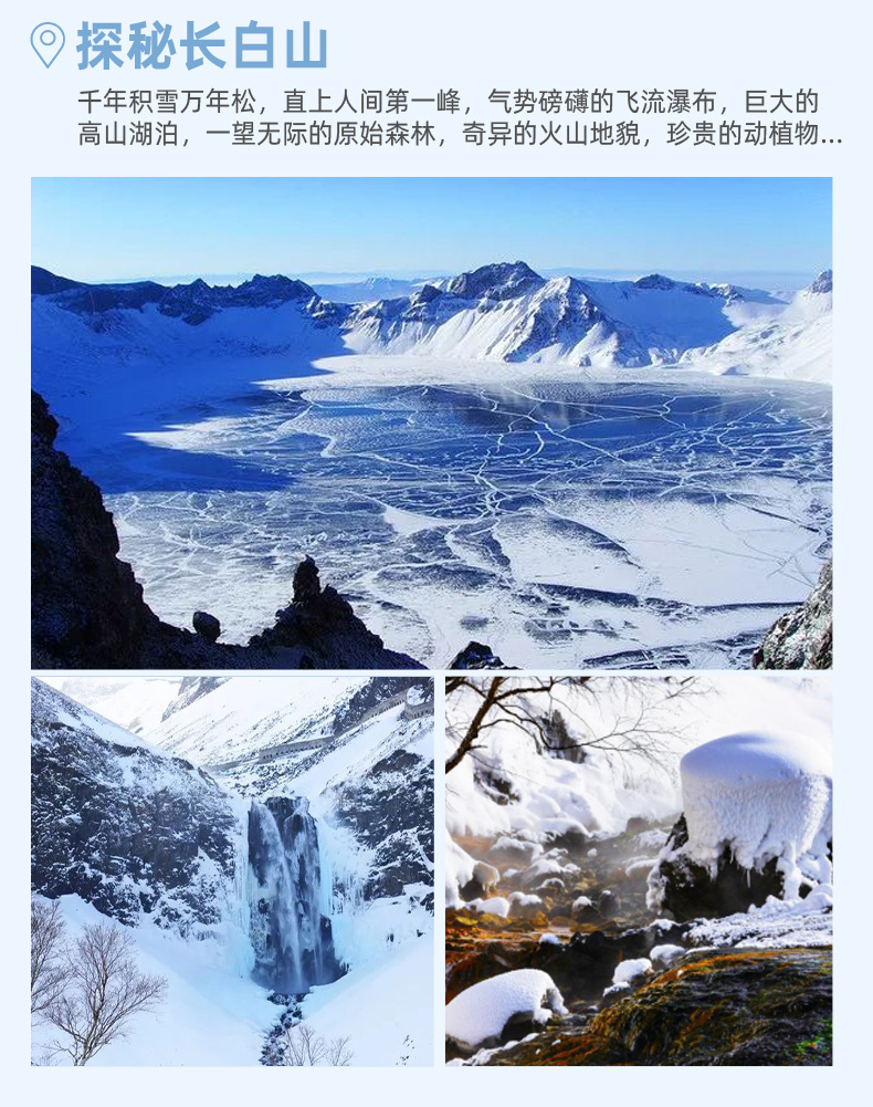 站在2691米的山巅,俯瞰被白雪覆盖的天池,湖面如镜,周边16峰环抱。虽然天池是否愿意展现真容需要缘分,但这份期待本身就已经很美。若得一见,那冰封的圣湖定会让你觉得所有的奔波都值得。![]()