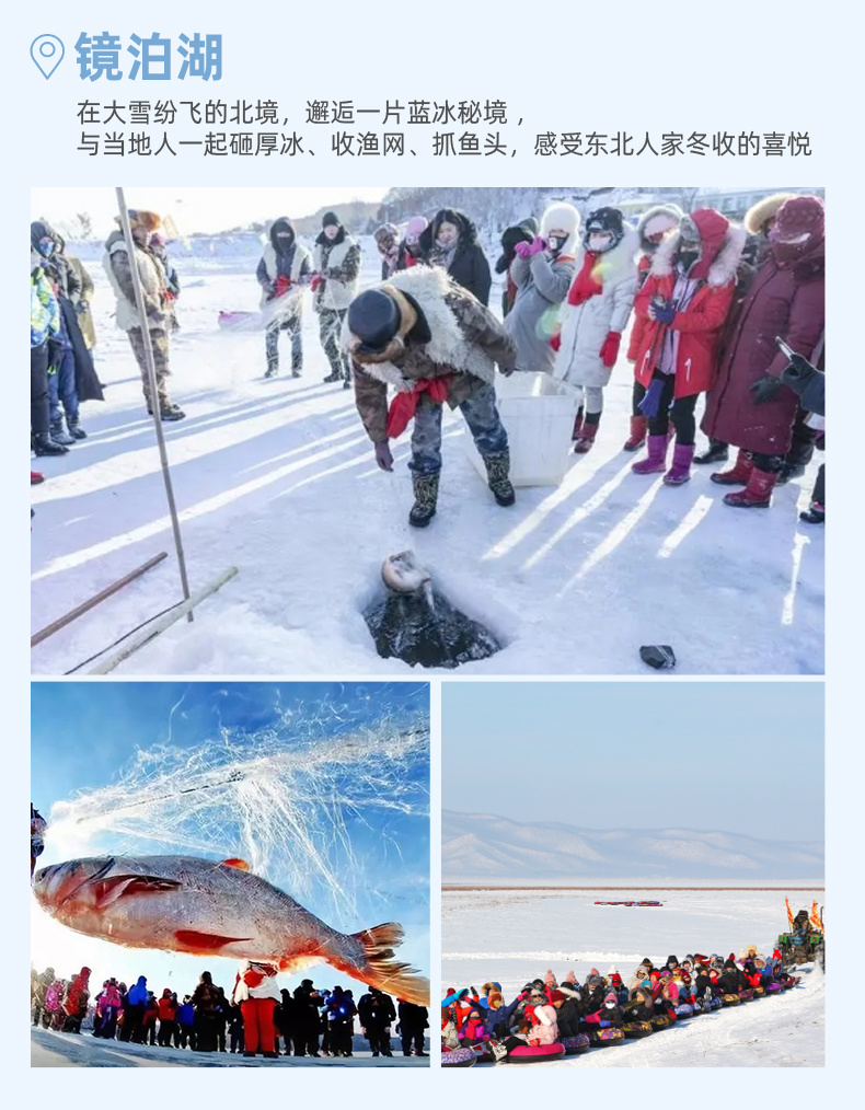 2️⃣冬捕收获随缘,请保持平常心,体验过程更重要,镜泊湖冬捕以及雪圈长龙12月15号以后冰面结冰期安排,如届时不开将替换成朝鲜族民俗园