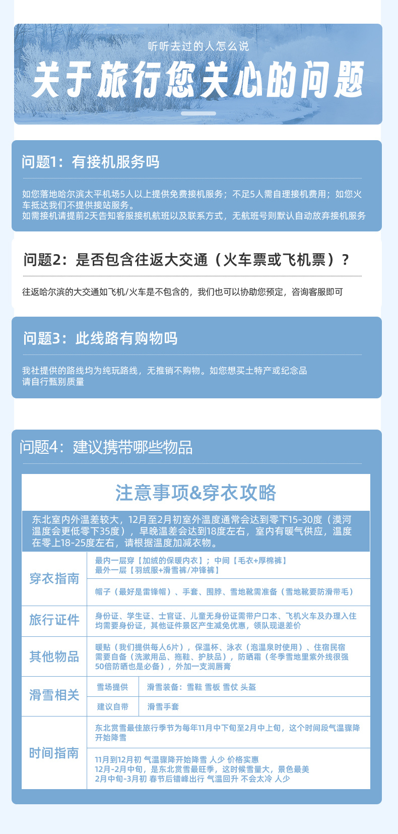 2、单房差:4晚酒店1100元每人,1晚雪乡农家炕单住报名时详询客服,报名人数为单数,需补1人单房差(1大1小报名,儿童默认占床必须补单房差)
