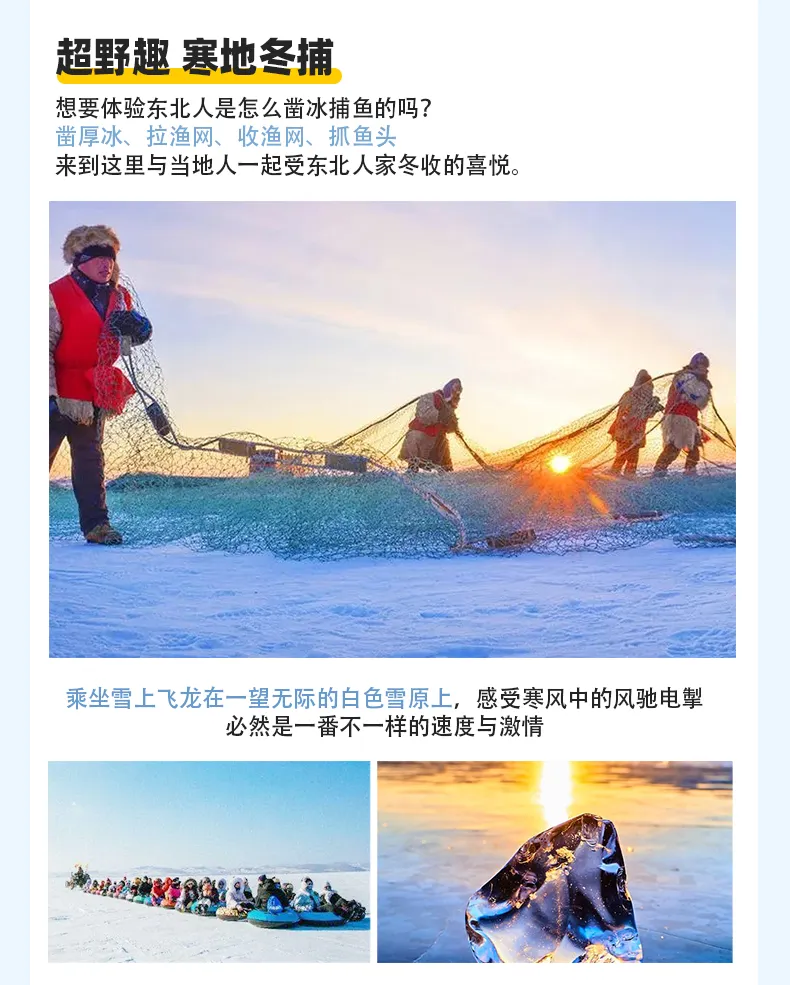 午餐后,我们将开启今天的重头戏——镜泊湖冬捕体验。乘坐【雪地飞龙】在冰面上飞驰,感受寒风拂面的刺激与畅快。在渔工的指导下,亲身体验传承千年的冬捕技艺。当第一网鱼从冰洞中捞出,活蹦乱跳的鱼儿在冰面上跳跃,那种收获的喜悦与震撼,将成为终生难忘的记忆。