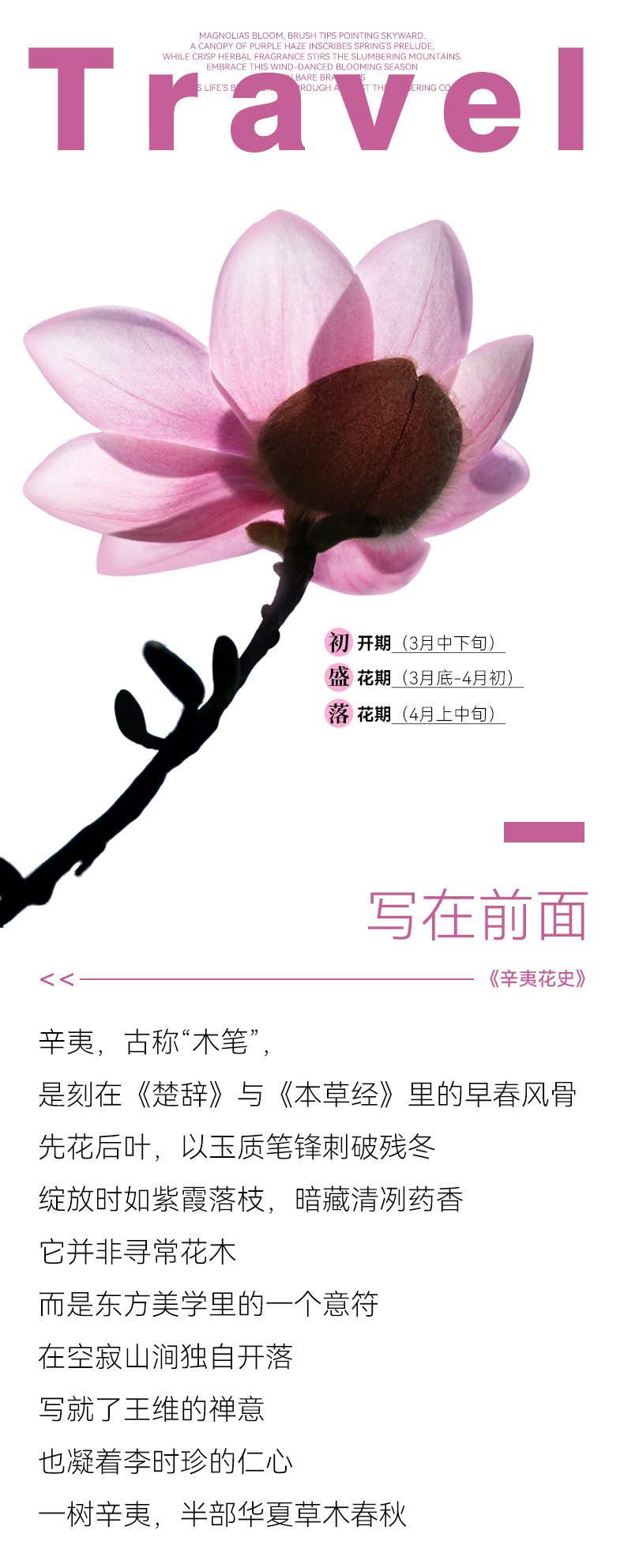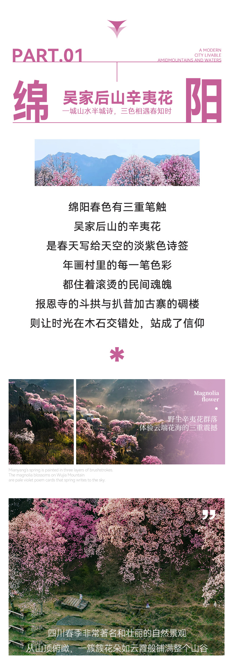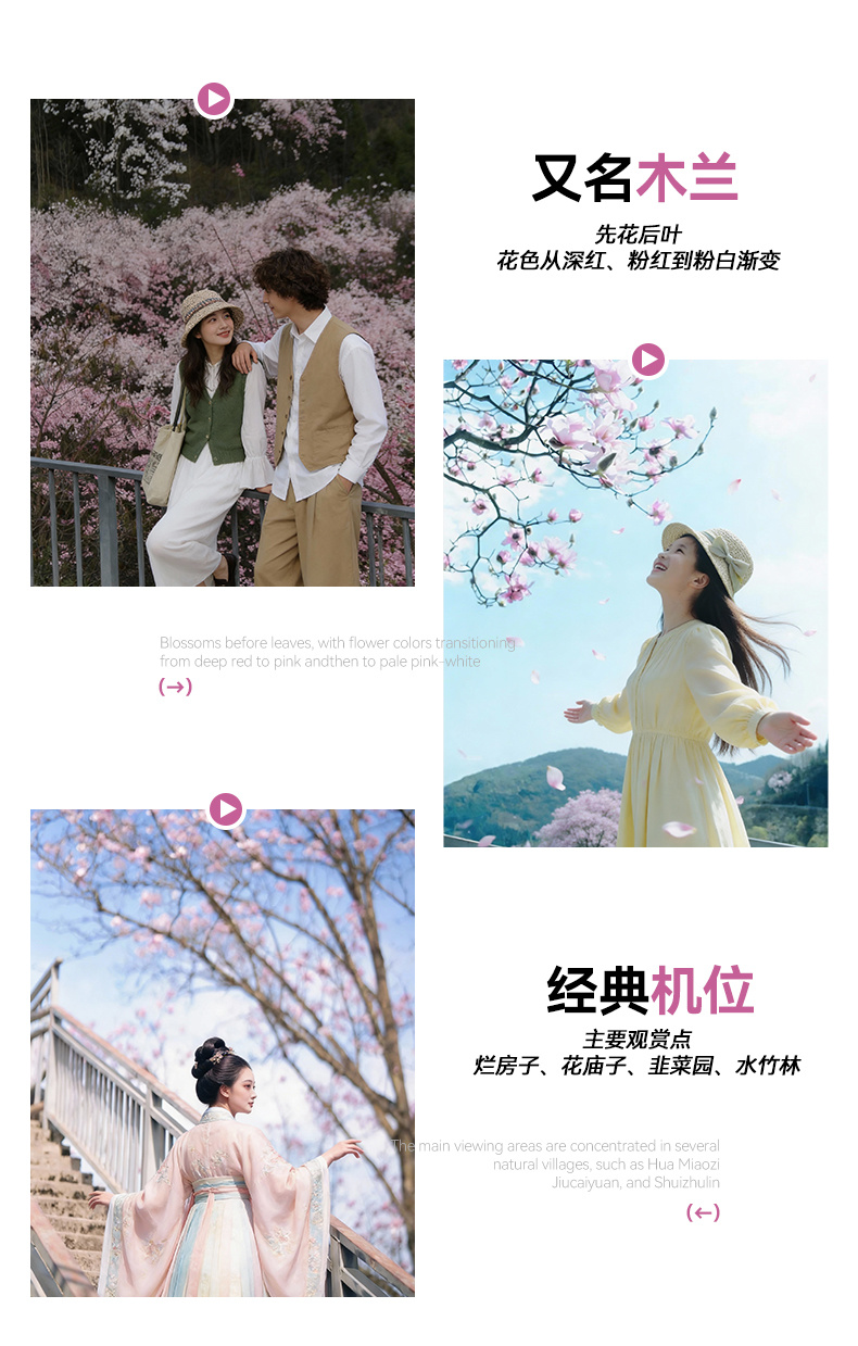 下午 & 晚上 (14:30-19:30):前往江油吴家后山(约120km,3h)。抵达后入住民宿并用晚餐。辛夷花最佳观赏期为每年3月底至4月初。