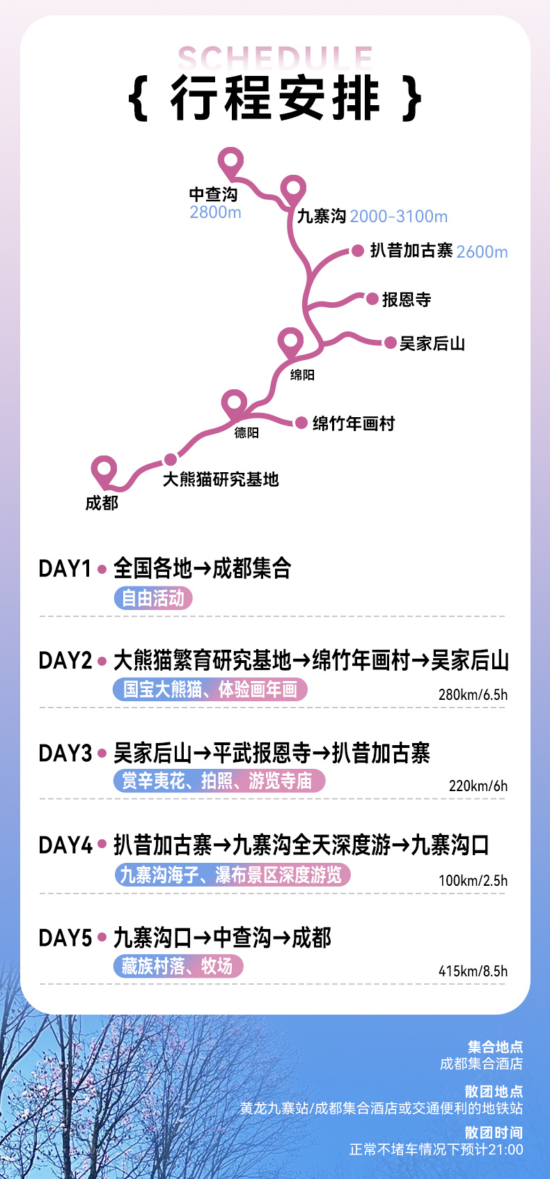 下午 & 晚上 (12:30-21:00):启程返回成都,跟车回成都(约400km,8h)可选黄龙九寨站散团,动车返回成都约2.5小时。