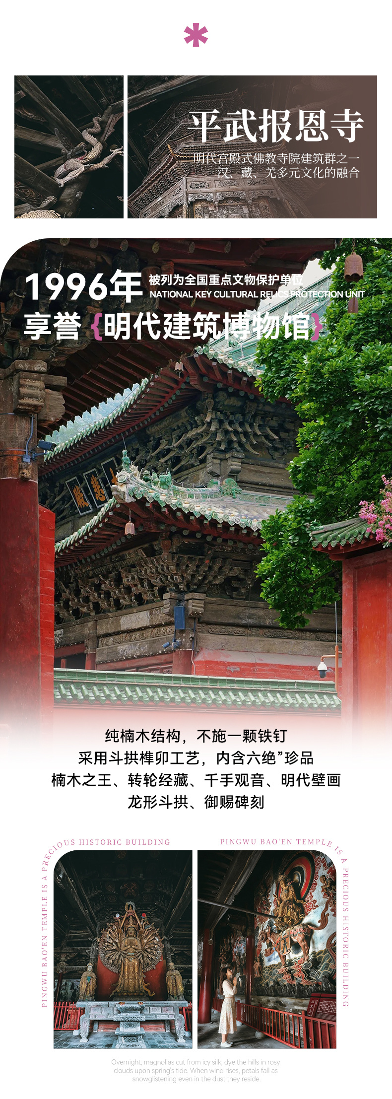 中午 (11:00-16:00):出发前往平武县(约140km,4h),在县城用午餐后,参观平武报恩寺(游玩1小时)。该寺开放时间为08:30-17:00。