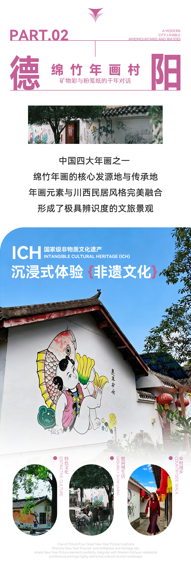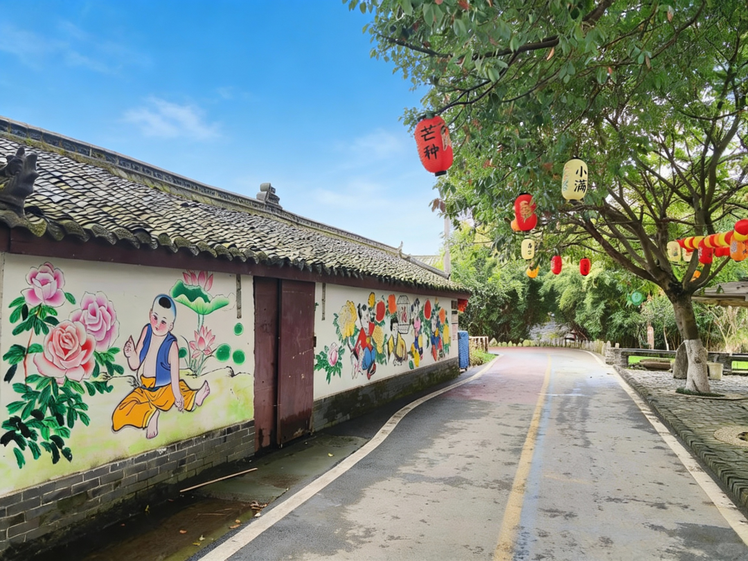 中午 (12:30-14:30):驱车前往绵竹年画村(约110km,2h)。可在此用午餐,并游览1.5小时。这里全年全天开放,可欣赏五彩斑斓的年画墙,还可以体验画年画体验。