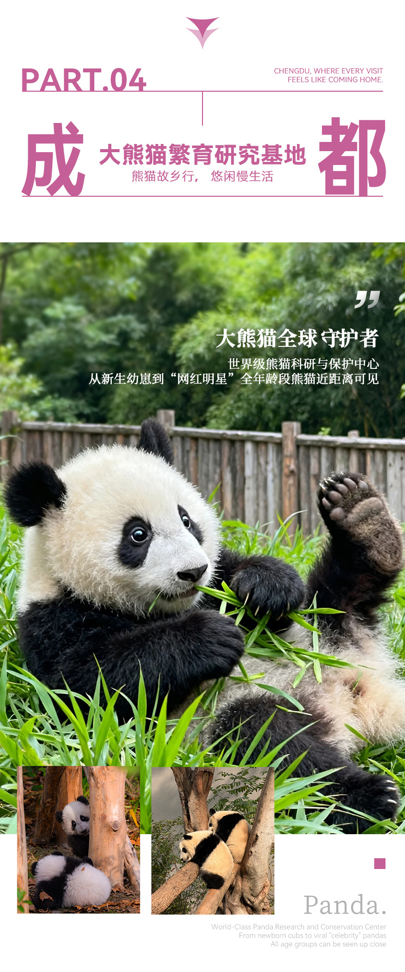 上午 (07:30-12:30):从成都出发,前往成都大熊猫繁育研究基地(约50km,1.5h)。建议游玩3小时,在07:30开园时尽早入园,以避开人流并看到更活跃的大熊猫。