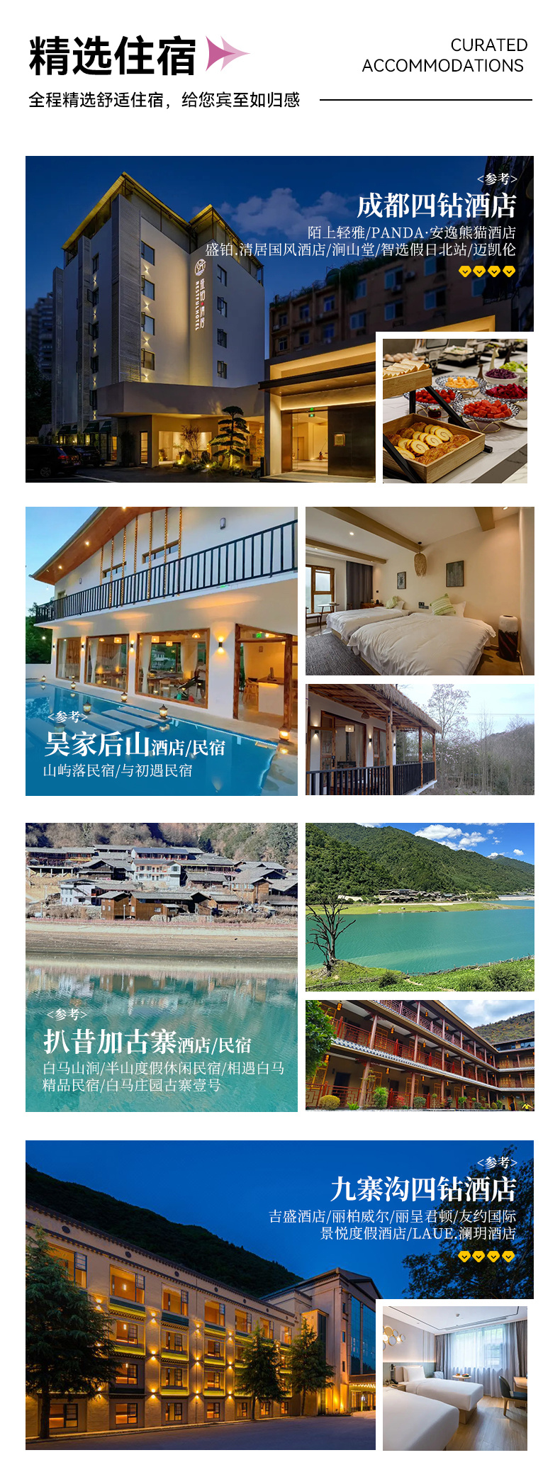 2.到酒店后报“辛夷九寨+姓名”拿房,房费已付,如需房间押金请自理。