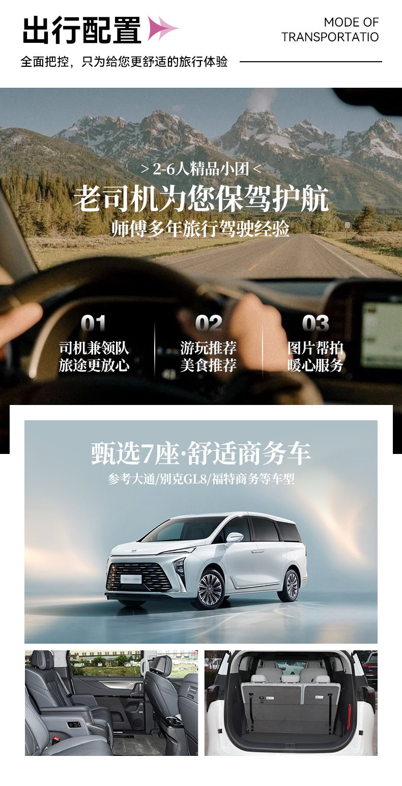 2. 行程用车参考:2-6人,7座大通/别克GL8/福特商务或同级。
