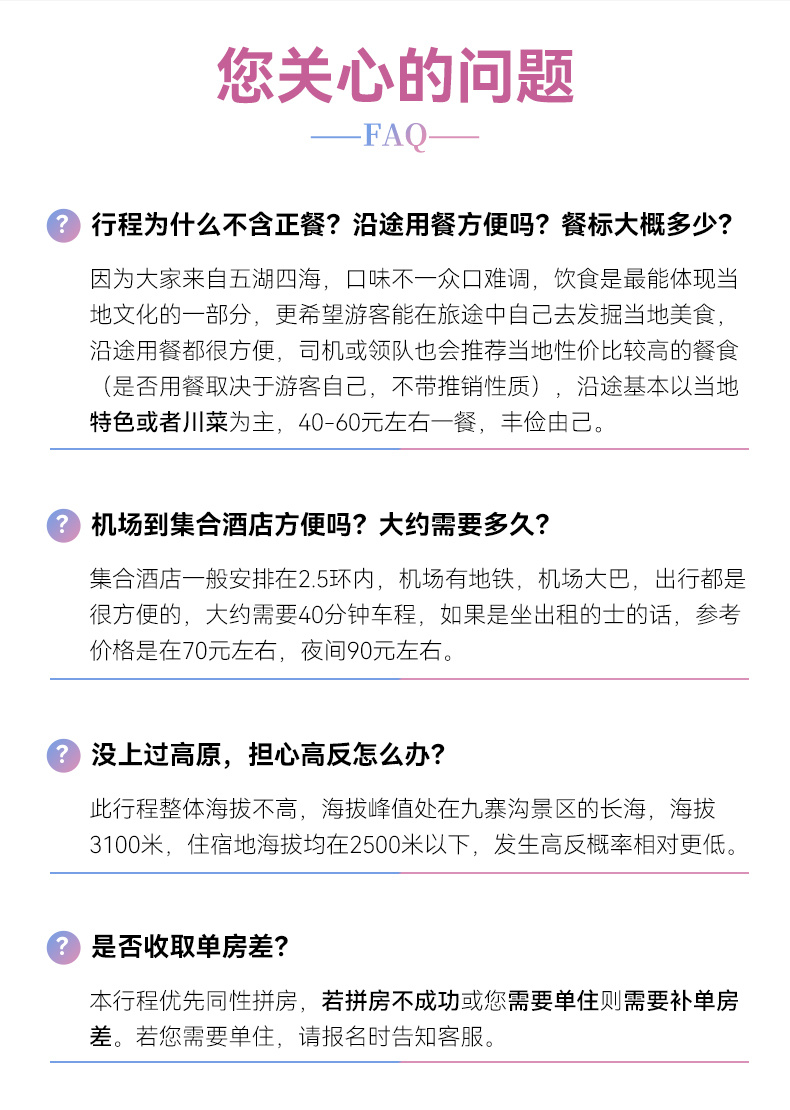 2、抵达成都时间约为21:00,由于川西的交通状况不是十分的理想,可能会因为修路、交通管制,堵车耽误时间,实际到达时间可能更晚。所以建议大家尽量购买次日离开成都的机票或火车票!