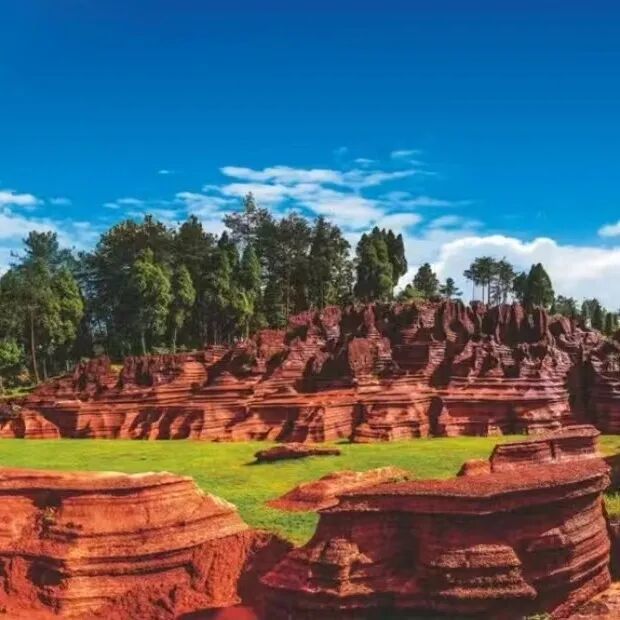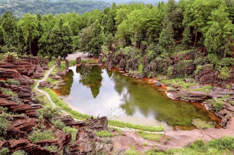 红石林国家地质公园是一片非常有特色的喀斯特地貌,位于湘西自治州古丈县境内。红石林曾经是奥陶纪的海底,后来在海水、雨水的侵蚀下形成了独特的喀斯特地貌,而含铁元素形成的红色又有丹霞地貌的感觉。现在眼前的是色彩鲜艳,造型优美的奇峰石林,石林中还有峡谷、溪流、清泉、如织毯样的草坪、古老的紫藤花,与石林相得益彰,宛如一个天然的园林。而禇红色的石峰有的如驼峰突起,有的如骏马奔腾,还有各种石墙、石洞、飞来石、天生桥等景色。