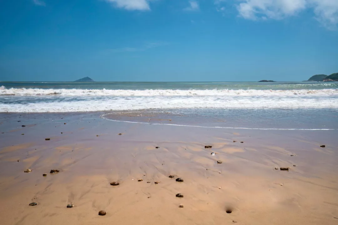 潮起潮落,远处蓝天白云、帆影点点,