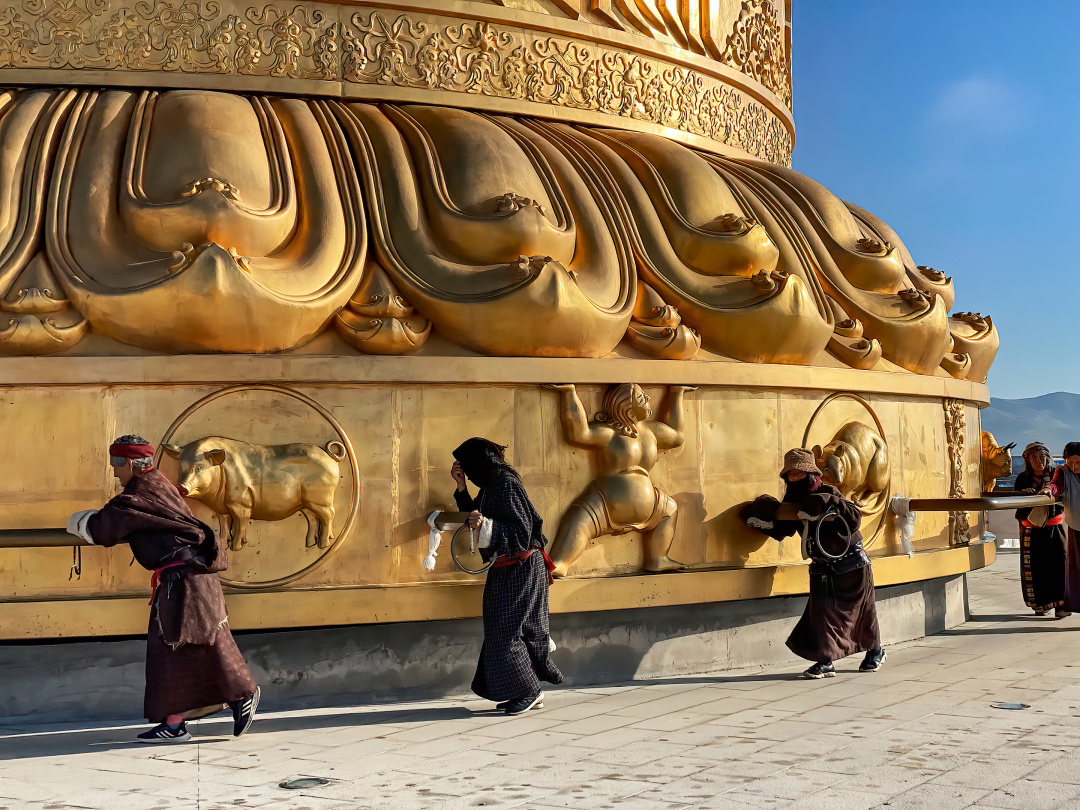 适时离开,前往【娘玛寺】,虽然娘玛寺的名气不如甘南州其他寺庙,但这里坐落着【世界最大转经筒】,该转经筒高达35.8米,下部直径12.43米,上部直径17.6米,重达320吨,创下世界吉尼斯记录!不光体积巨大,整个筒身用掉黄金100多斤,仅仅经书的重量就高达86吨,对于虔诚的藏族人来说,转经筒里装的经咒越多、转一圈的周长越长,那么转一圈积累的功德就越多。