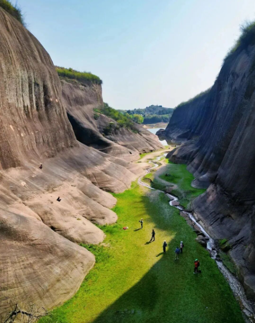 在枯水期碧水退去,红色的丹霞地貌裸露,形成峡谷、溶洞和草原风光。全程五公里,用时三小时之后返回武汉
