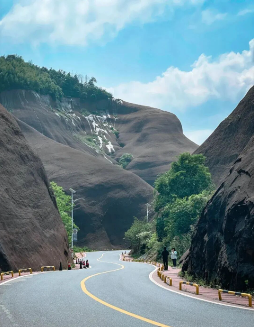 一块尚未开发的丹霞地貌处女地,一条公路犹如天路屹立在丹霞峡谷中间,被誉为“中国十大最美公路”之一,全长5公里,前半部分道路两边光滑无物,都是丹霞地貌,后半部分道路两边竹林环绕。因其陡峭壮观而闻名。