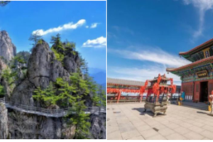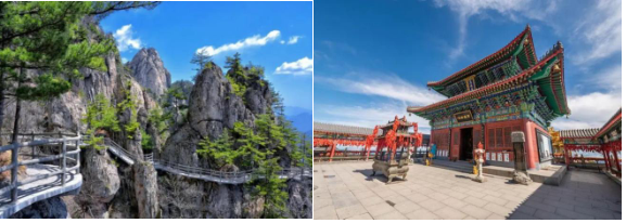 客人换乘景区中灵索道上老山,沿途观看灵宫殿景区,到救苦殿停车场下车,徒步观赏舍身崖、飞来石、传经楼、观音殿等景点。感受伏牛第一峰山势雄伟、云海红叶、群峰竞秀、千姿百态的自然生态景象。